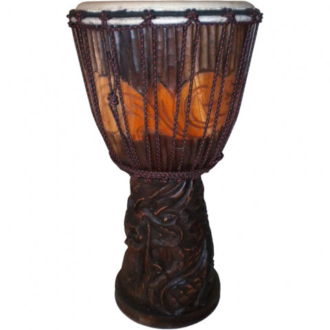 A djembe is a rope-tuned skin-covered goblet drum played with bare hands, originally from West Africa. According to the Bambara people in Mali, the name of the djembe comes from the saying "Anke djé, anke bé" which translates to "everyone gather together in peace" and defines the drum's purpose. In the Bambara language, "djé" is the verb for "gather" and "bé" translates as "peace."